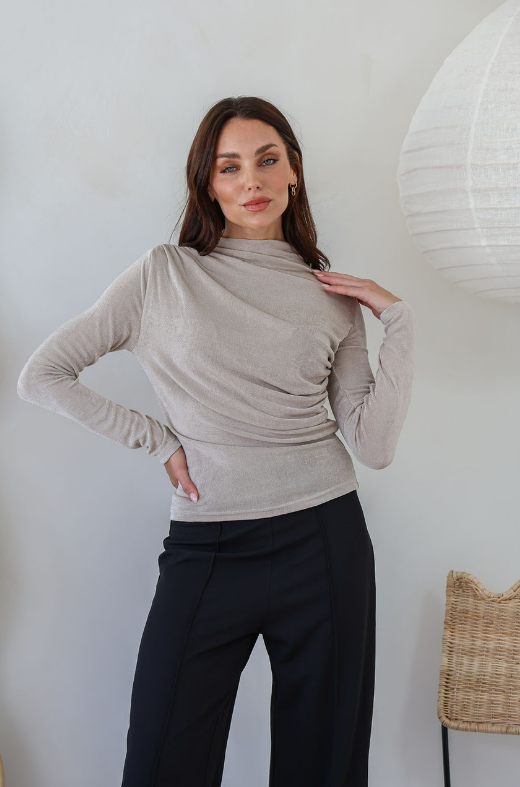 Get ready to up your fashion game with our Andi Drape Top in Latte! This sleek and stylish top is perfect for taking your look to the next level. With a dressier style, you'll be turning heads and feeling confident all day long. Upgrade your wardrobe with our Andi Drape Top - because you deserve to look and feel amazing.