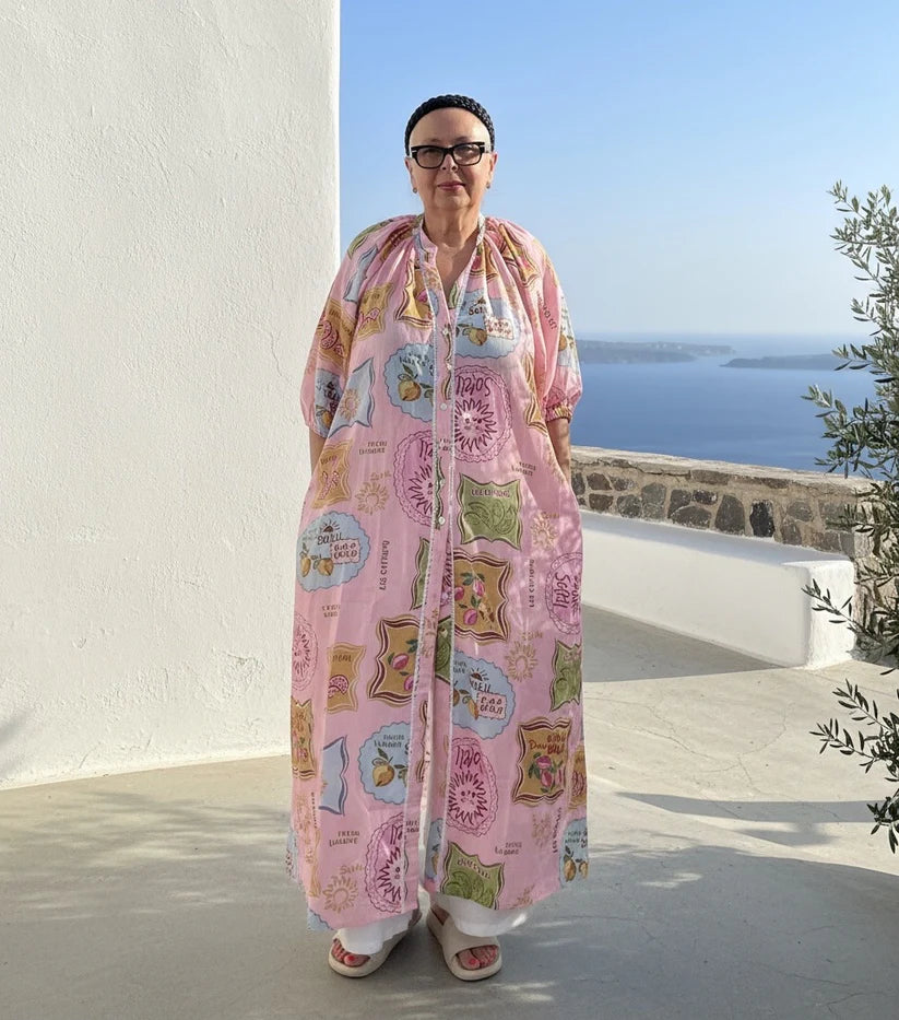 Bring a fresh Mediterranean feel to your collection with our new vibrant printed dress. Crafted from a breathable linen blend, this style features an all over patchwork print with playful fruit motifs and subtle Italian inspired details. Designed in an easy, relaxed silhouette, it offers a comfortable fit with 3/4 sleeves, a button through front and a mandarin collar is perfect for warm-weather styling.