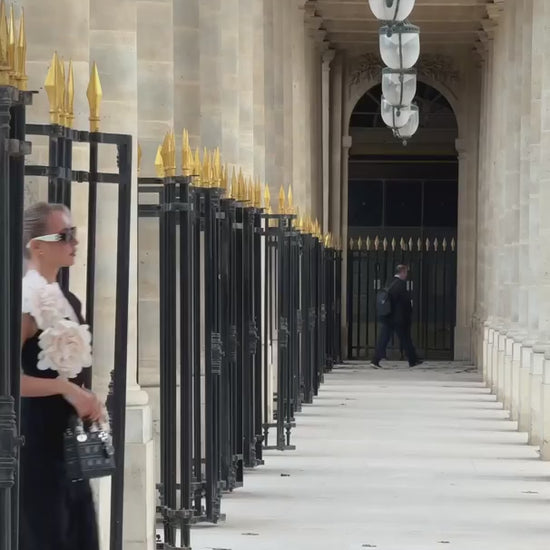 The dramatic plunge V-neckline creates a striking silhouette, balanced by the artful contrast flower trim that adds texture and sophistication. Fully lined for a seamless fit, it fastens at the centre back with an invisible zipper, maintaining a smooth, sleek profile.