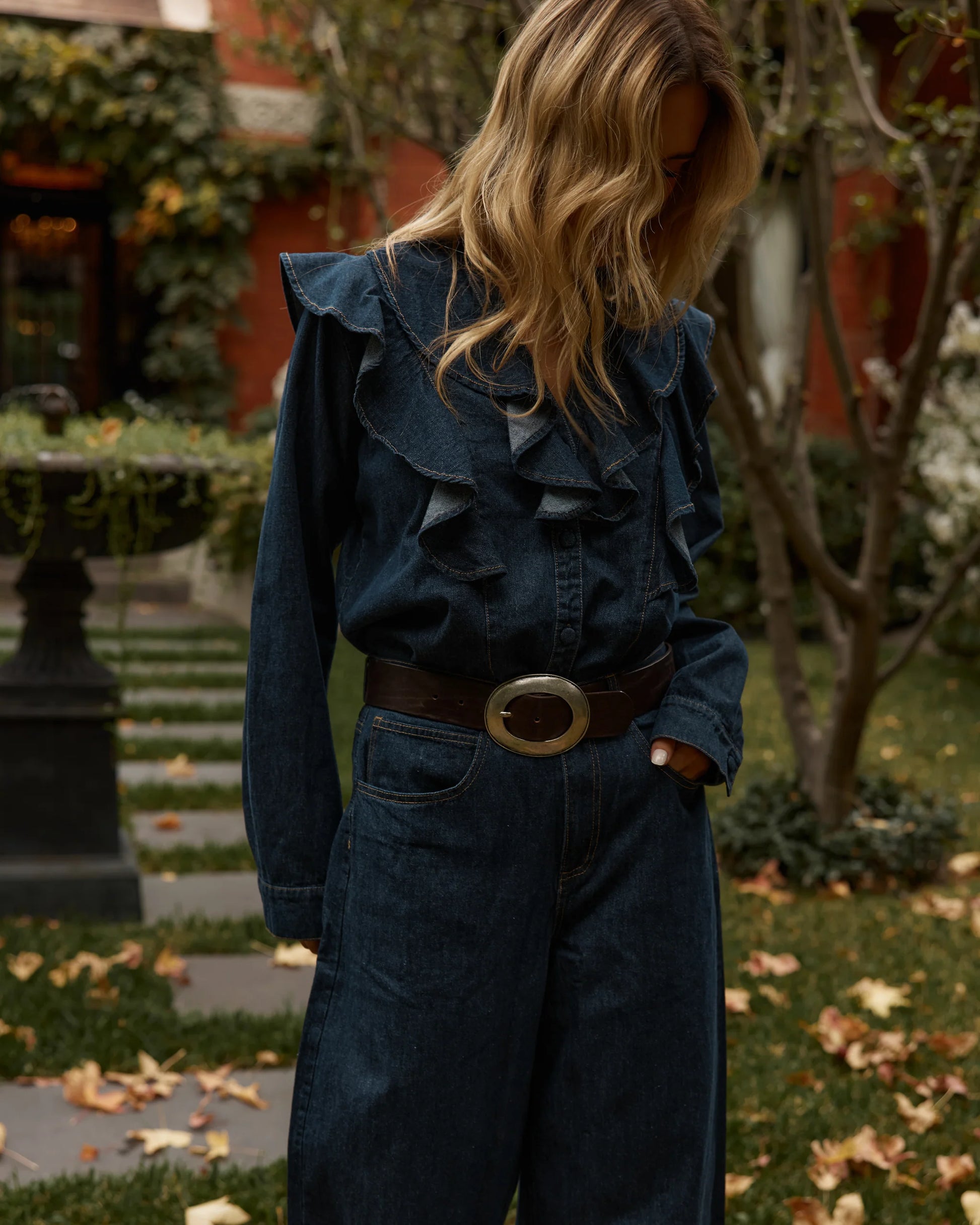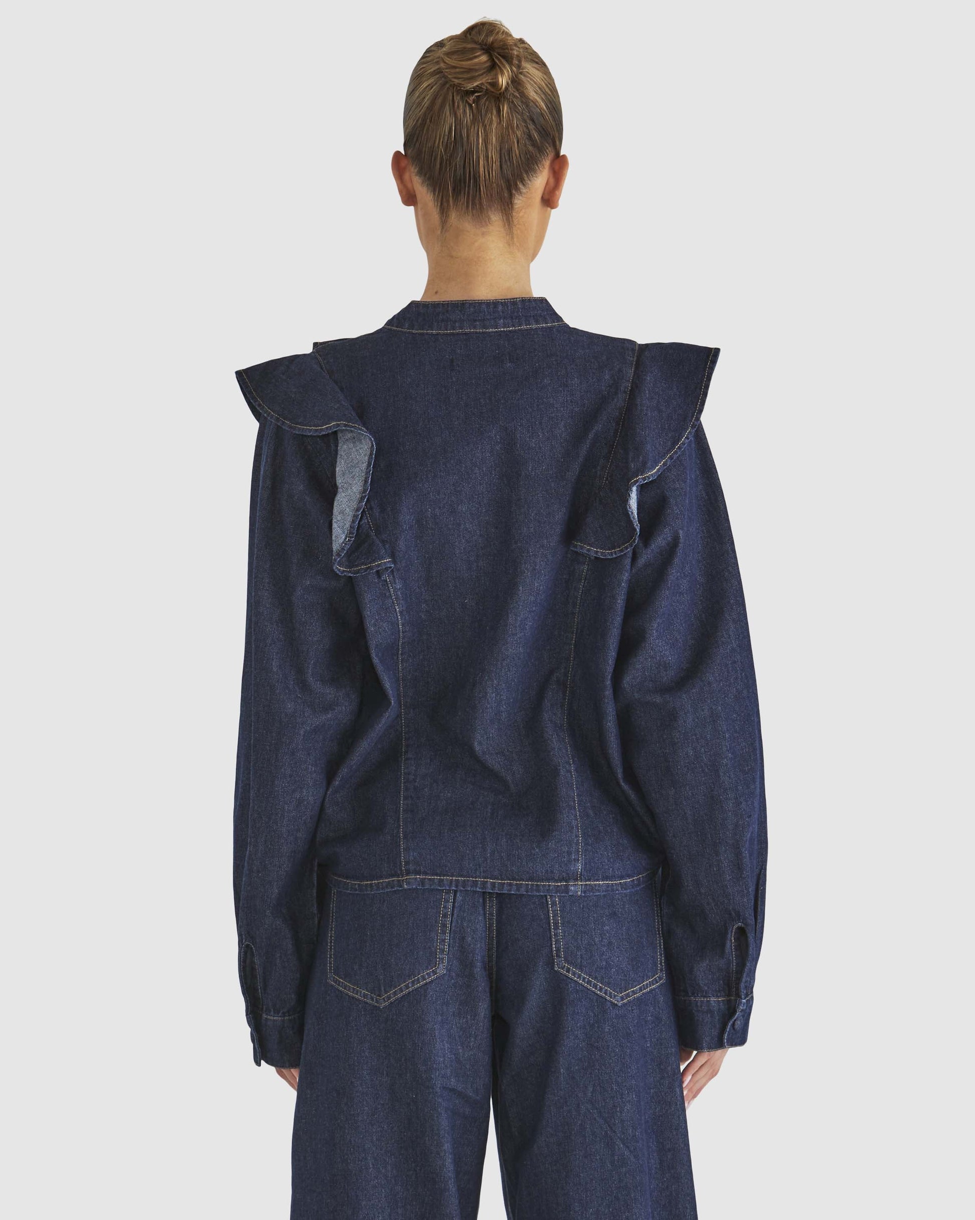 A fresh take on a classic staple, the Soaring Shirt features a stand collar and soft denim frill details. Self-covered buttons add a refined touch, while the regular fit ensures effortless wearability. Crafted from denim fabric, this top is perfect for both structured and relaxed styling. A polished essential for modern dressing.
