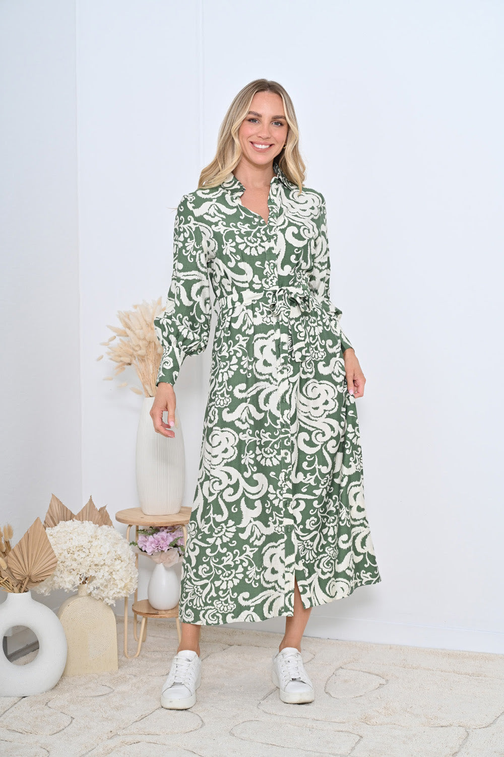 Step into effortless charm with the Karly Maxi Shirt Dress in green. This easy-to-style piece brings a playful vibe to your wardrobe, perfect for days when you want to look put-together without trying too hard. Its flowing silhouette and vibrant color make it a delightful choice for any occasion.