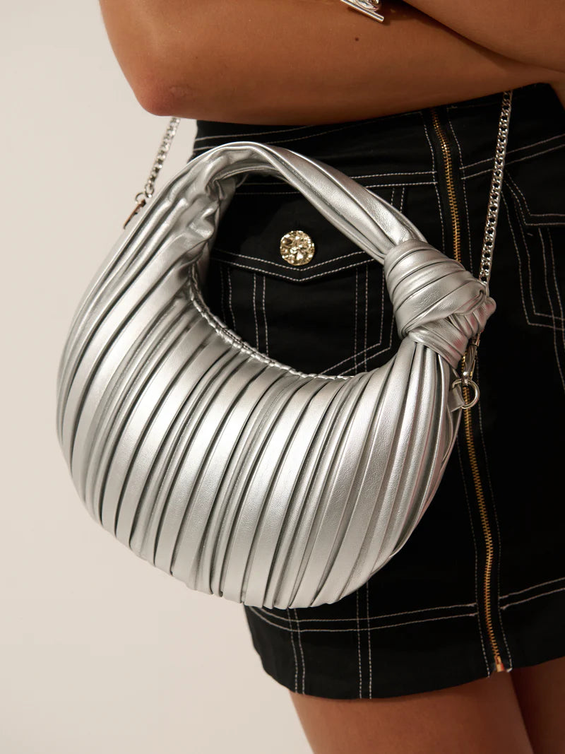Features pleated soft vegan leather bag, with top handle and detachable crossbody chain straps.