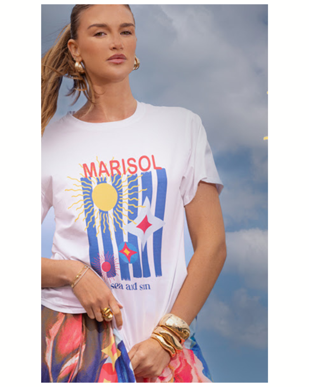 Our Marisol Tee is a short sleeve graphic tee with a fun, hand drawn design. She brings summer vibes with her "Marisol - Sea & Sun" graphic! With a relaxed fit, curved hemlines and a slightly longer cut to the back, it's sure to be a fave this season.