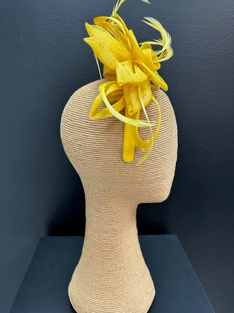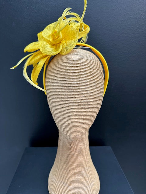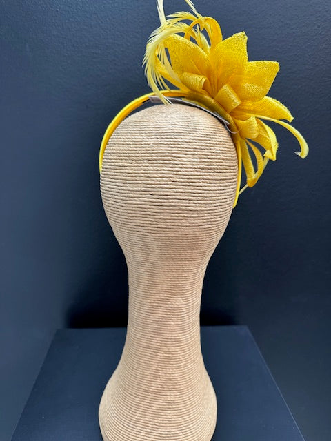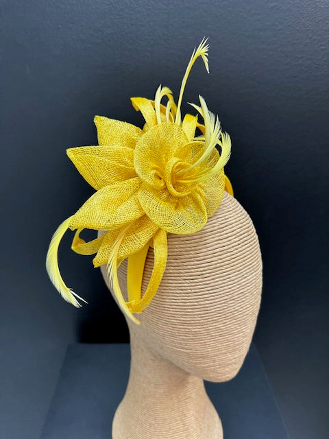 Hand made yellow sinamay flower with soft feathers. Great choice for any spring racing outfit.