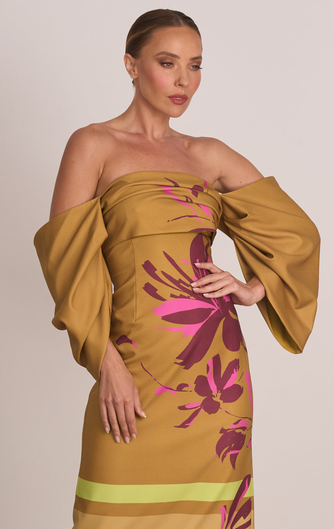 The Flicker Party Midi by PASDUCHAS is made from a stretch twill suiting featuring an exclusive floral placement print. A strapless neckline flatters this streamline column silhouette elevated by the loosely slouched caped sleeve. Playing with proportion to create a contemporary off shoulder look.