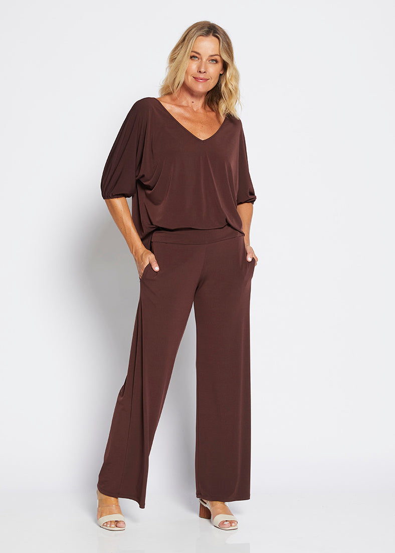 Get two looks for the price of one with this revesible tee. Wear with a v-neck or scoop neck. The slinky jersey fabric and elbow length sleeve elevate this wardrobe staple to something that can be dressed up or down. Wear with coordinating chocolate jersey pants for a faux-jumpsuit look!
