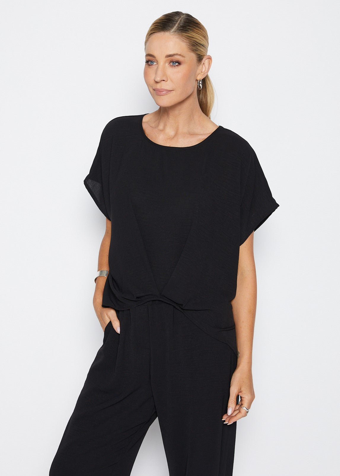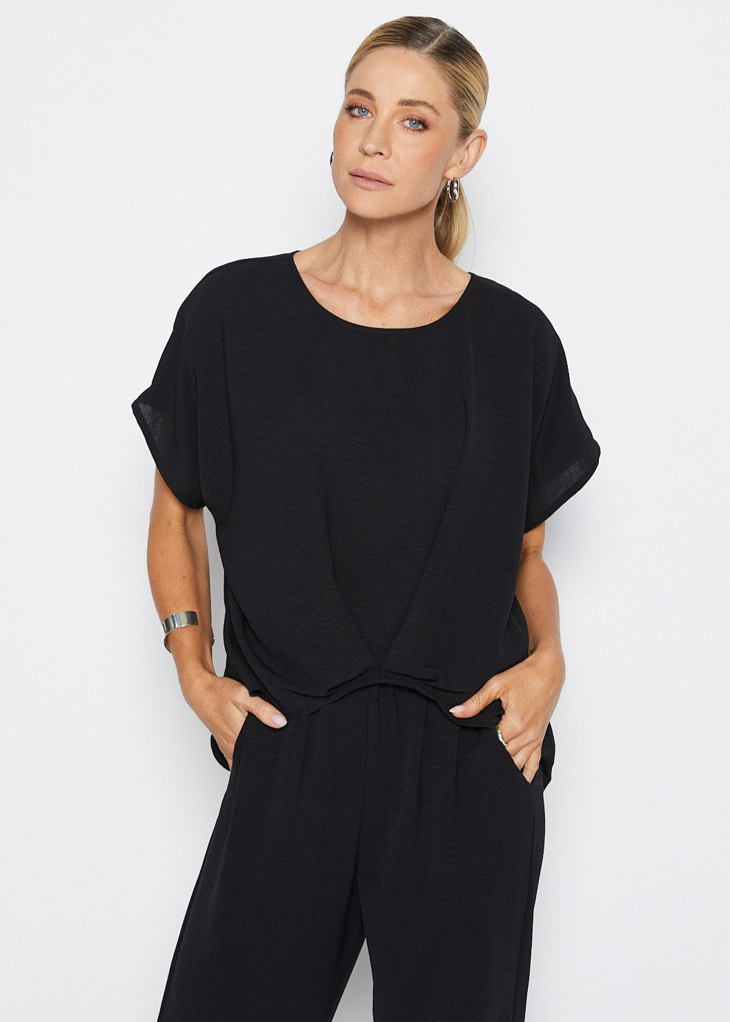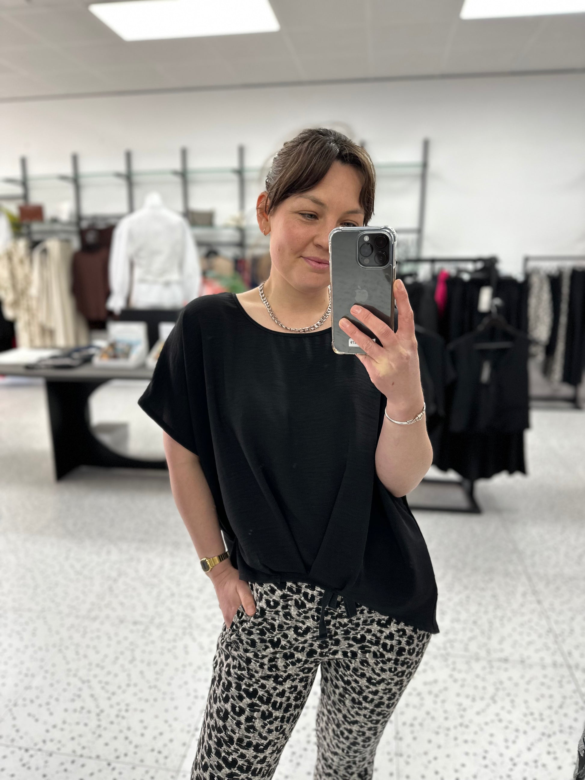 The Origami top features a pintuck detail at the front for a flattering shape. Great back with printed pants or to give a tucked-in look without needing to tuck. Team with printed pants for work with a blazer or style with coordinated pants like Franco for a head to toe look.  Made from an easy cate hammered crepe fabric, you can pop it in the washing machine, hang to dry, no need to iron!