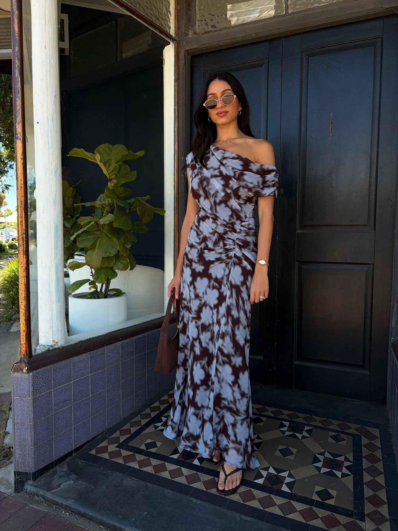 Turn heads in this elegant one-shoulder evening gown, designed for timeless sophistication. Crafted, this floor-length dress features an asymmetrical neckline with a beautifully draped shoulder detail. Subtle ruching along the side creates a flattering silhouette, while the smooth flowing hem adds graceful movement with every step.