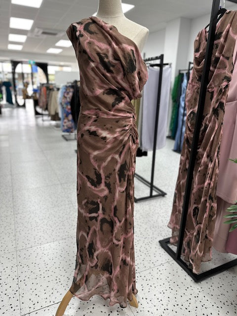 Turn heads in this elegant one-shoulder evening gown, designed for timeless sophistication. Crafted, this floor-length dress features an asymmetrical neckline with a beautifully draped shoulder detail. Subtle ruching along the side creates a flattering silhouette, while the smooth flowing hem adds graceful movement with every step.