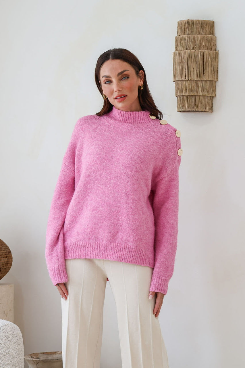 Get ready to layer up in style with the Roxx Gold Button Knit in Pink. This comfortable knit is the perfect addition to any outfit, providing both style and warmth.