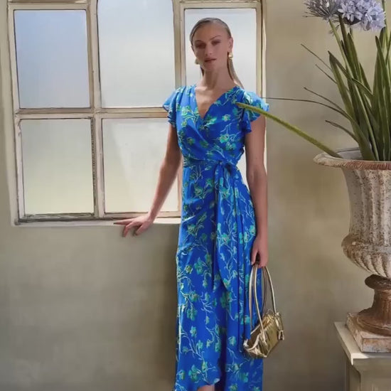 • Iconic SACHA DRAKE wrap design • Luxurious silk rayon fabric • Blue metallic floral burnout print • Print is exclusive to SACHA DRAKE • Lined through the body • Fluted cap sleeve • Maxi length • Hi-lo hemline • V-neck • Perfect for weddings, formal and evening events • Designed in Australia