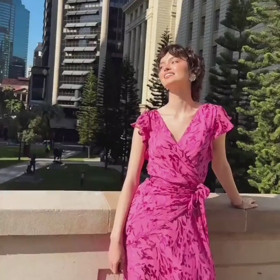 • Iconic SACHA DRAKE wrap design • luxurious silk rayon fabrication • Pink metallic floral burnout print • Print is exclusive to SACHA DRAKE • Satin lined through the body • Fluted cap sleeve • Removeable shoulder pads • Maxi length • Hi-lo hemline • V-neck • Perfect for formal weddings, events and evenings • Designed in Australia