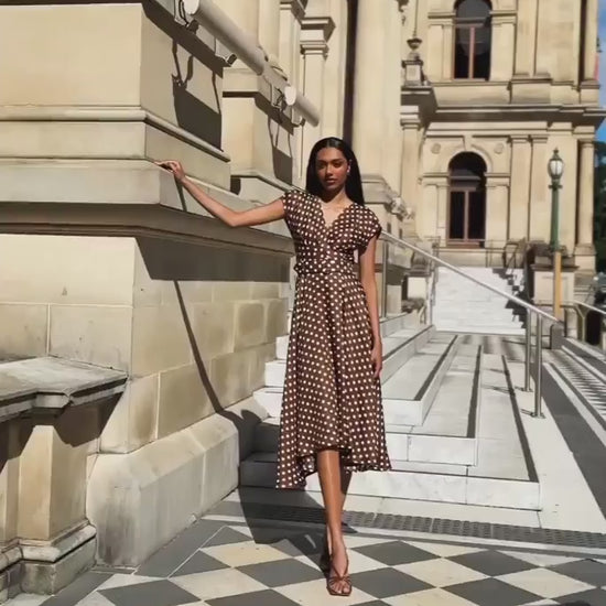 • Luxurious printed silk linen • Iconic SACHA DRAKE wrap style • Polka Dot print • Front pleat detailing • Comes with detachable flower • Flower has both a clip and brooch fastening • Comes with a detachable self-fabric belt • If wearing belted, tie the dress, tuck the ties to the side and fasten the belt over the top • Hi-lo hemline • Cap sleeve with tuck detailing • Midi length • Designed in Australia • True to size • Wrap style allows for a more flexible body fit