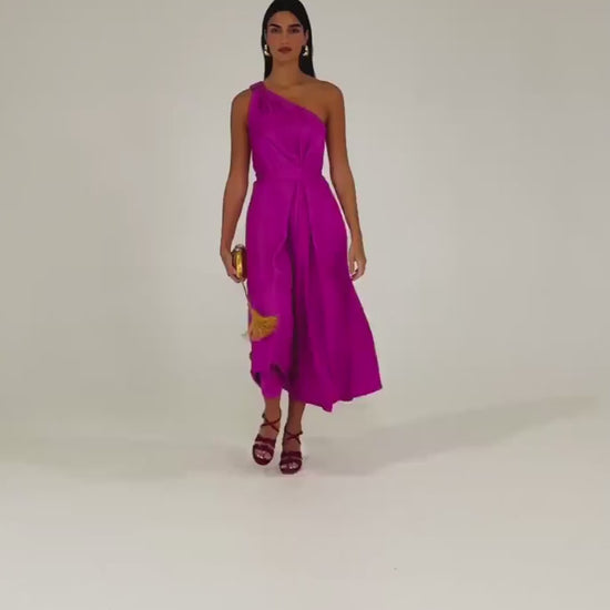 The Orleans One Shoulder Midi Dress is made from a luxurious viscose jacquard and adorned with a subtle metallic floral print for elegance. With a one shoulder neckline, flattering A-line skirt, and a self-tie belt to shape the waist, it's the perfect piece for weddings and special events.