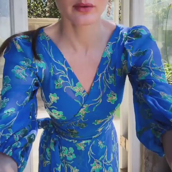 • Iconic SACHA DRAKE wrap design • Luxurious silk rayon burnout fabric • Blue Floral print is exclusive to SACHA DRAKE • ¾ Bloused sleeve • V-neckline • A-line skirt • Hi-lo hemline • Midi length • Stretch jersey slip included • Slip has adjustable straps to fit your body • Wear slip reversed for added bust coverage • Perfect for weddings and events • Designed in Australia