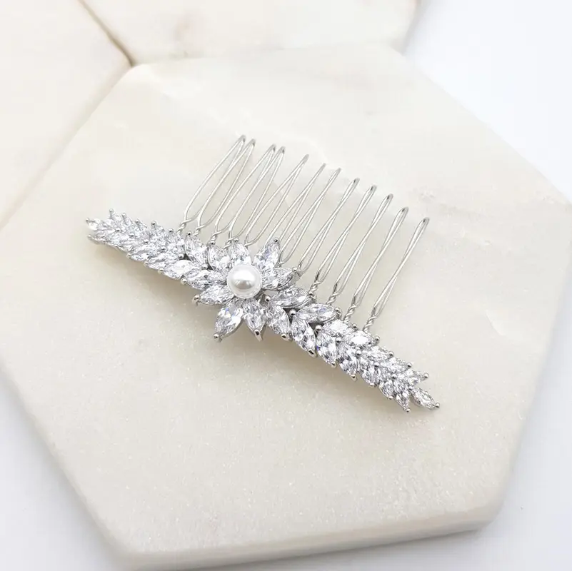 Chrysalini Sparkling Marquise CZ & Ivory Glass Pearls Hair Comb - Silver