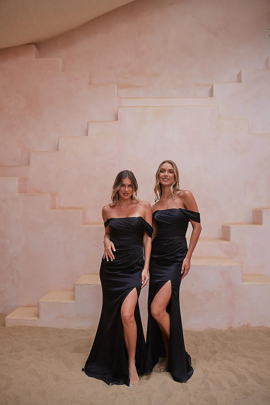 Crafted from a light stretch satin, this dress offers both comfort and a touch of luxury. The bodice features a straight-across neckline with pleated detailing and elegant off-the-shoulder gathered straps, adding a touch of modern charm to the design.