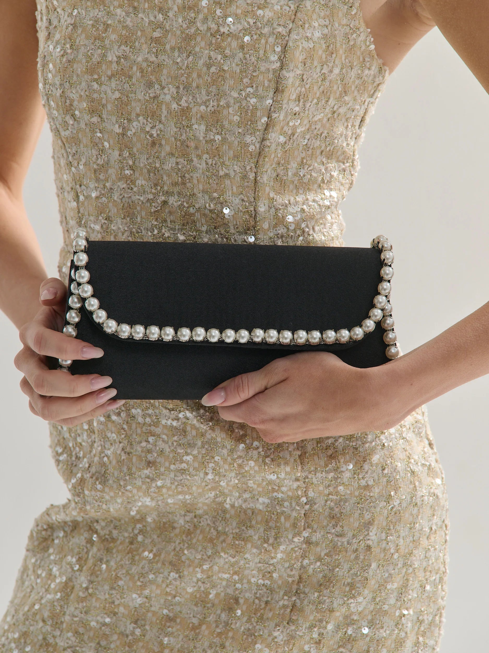 Exude elegance and sophistication with our Yvette Pearl Trim Clutch Bag in Black. This exquisite clutch features luxurious pearl trim detailing and a sleek design, perfect for any special occasion. Elevate your style and add a touch of grace to your outfit with this timeless accessory. Features removable metal chain shoulder strap, magnetic button closure and 1 internal card slot.